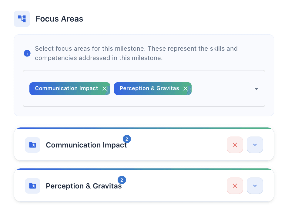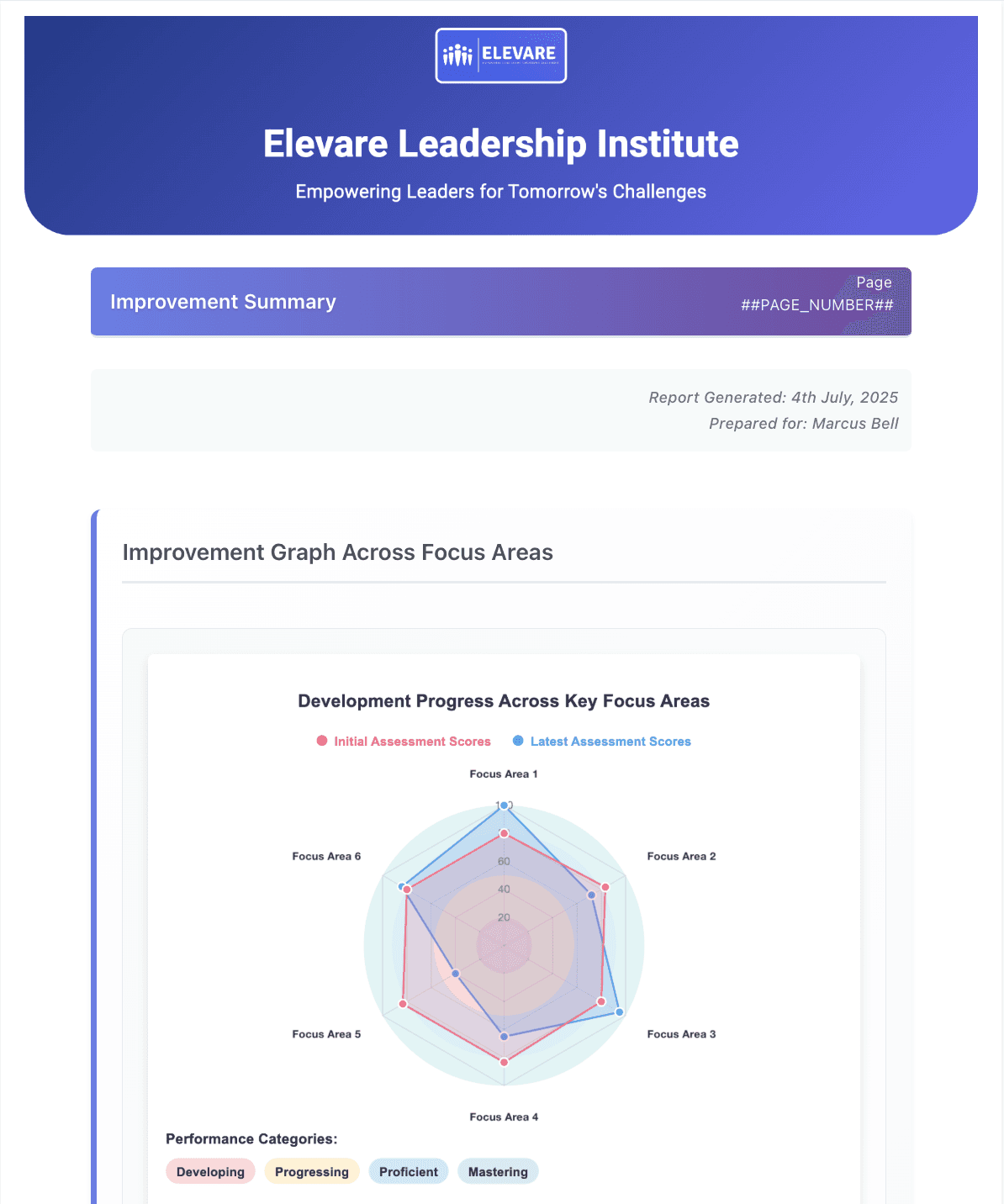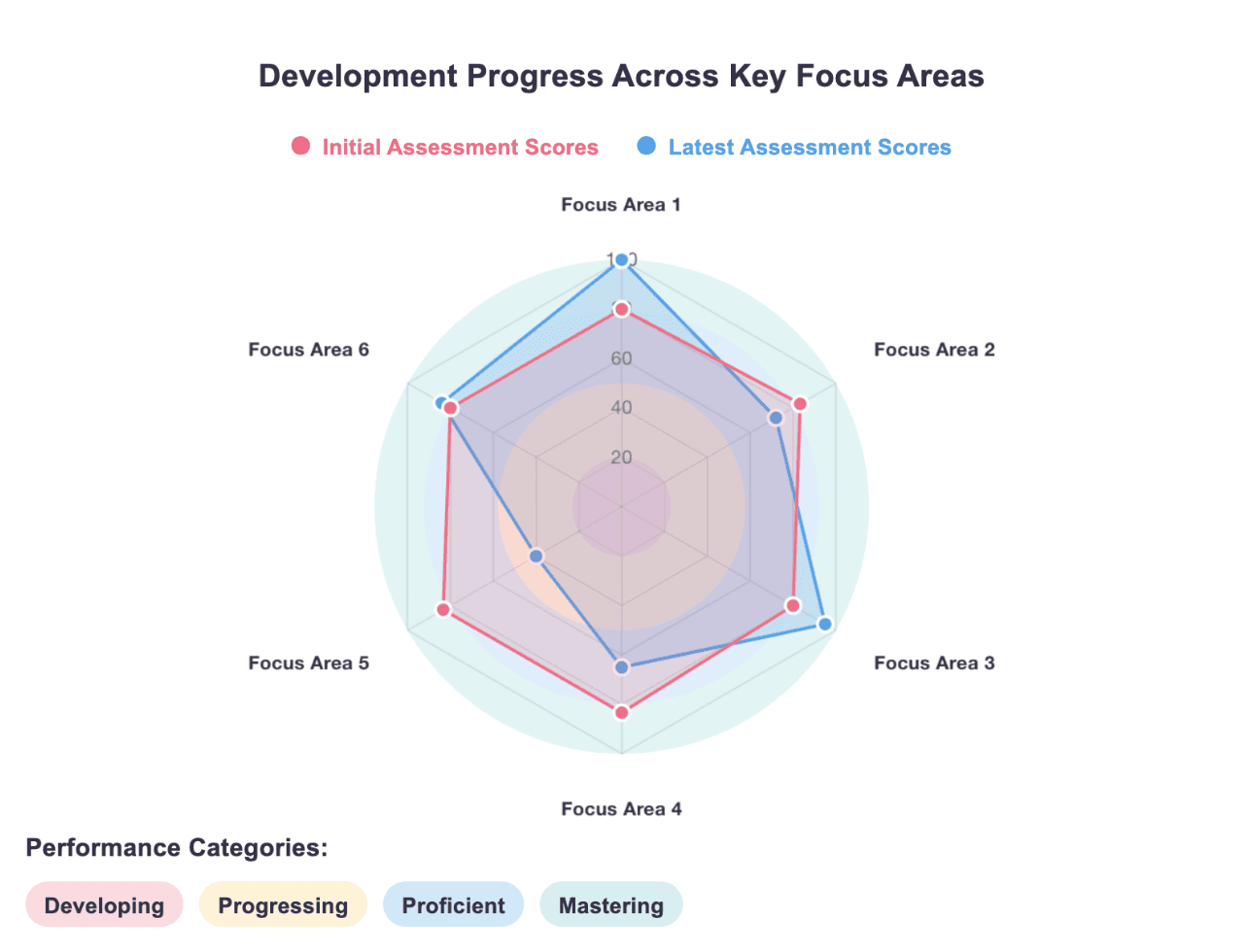 Track how each focus area evolves, milestone by milestone, through assessments, peer feedback, and self-reflections.
