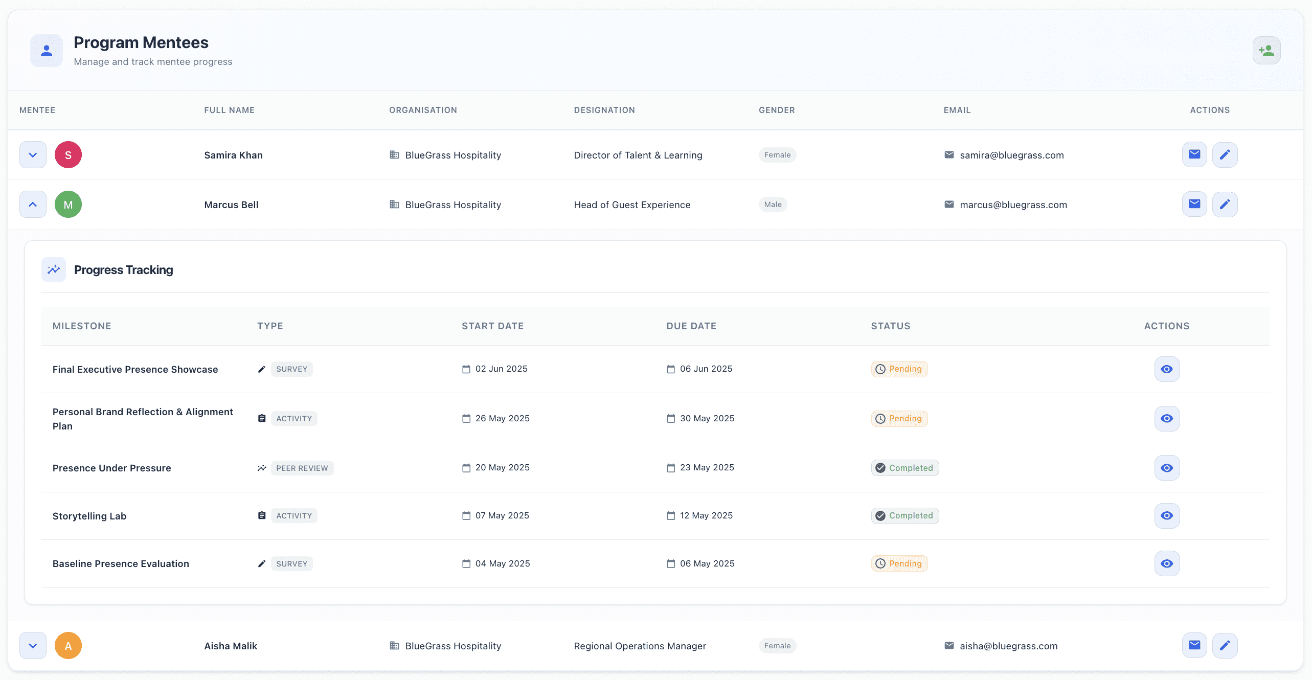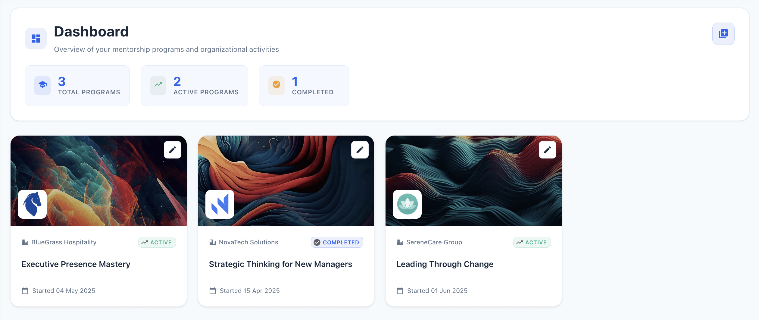 View and manage all coaching programs, individual clients, and organizational partners in one streamlined interface. Clarity without the clicking around.